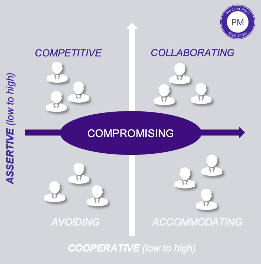 Compromising (Compromis) : Cette stratégie implique de rechercher une solution intermédiaire qui satisfait partiellement les besoins de toutes les parties impliquées. Les compromis peuvent être utiles lorsque le temps est limité ou lorsque les parties ont des objectifs incompatibles. Cependant, cela peut conduire à des solutions qui ne sont pas optimales pour toutes les parties et qui peuvent ne pas résoudre complètement le conflit.
